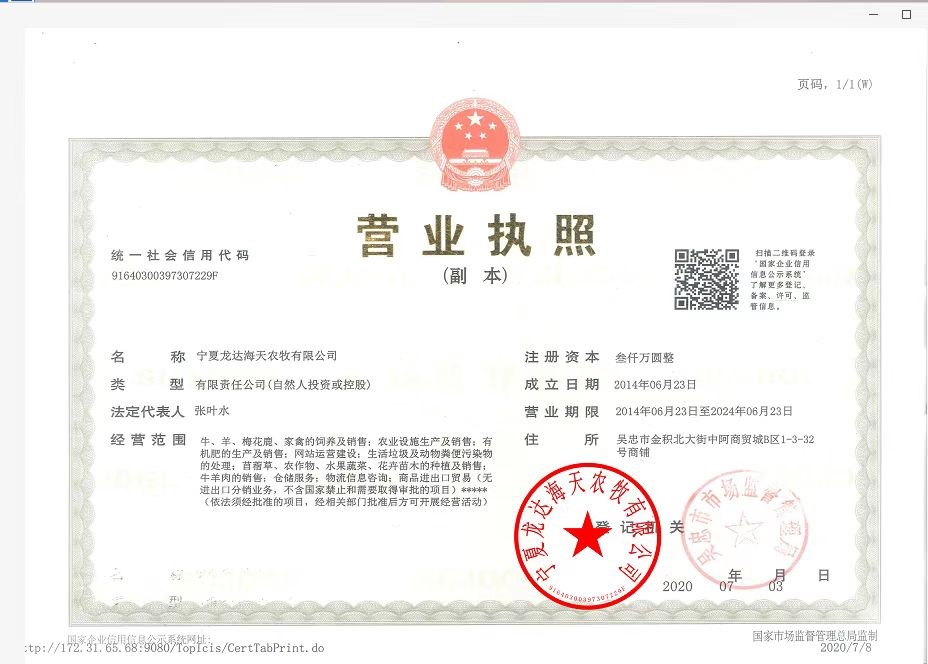 寧夏龍達(dá)海天農(nóng)牧有限公司 此公司營(yíng)業(yè)執(zhí)照已上傳驗(yàn)證